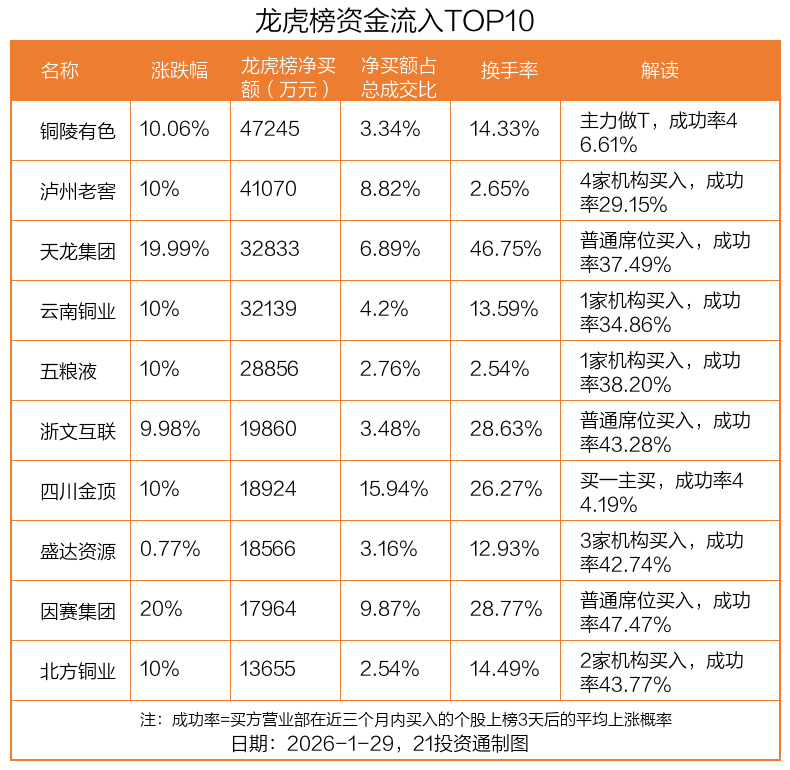 1月29日,上证指数上涨0.16%,深证成指下跌0.3%,创业板指下跌0.57%。盘后龙虎榜数据显示,共有55只个股因当日异动登上龙虎榜,资金净流入最多的是铜陵有色(000630.SZ),达4.72亿元。