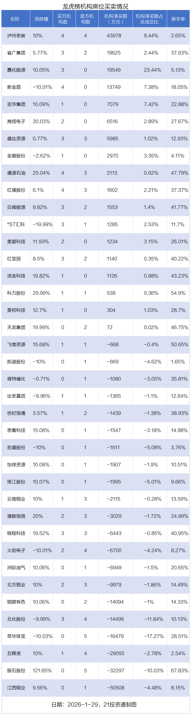 1月29日,39只个股龙虎榜出现了机构的身影,机构合计净卖出7.4亿元。具体来看,机构净买入18股,净卖出21股。