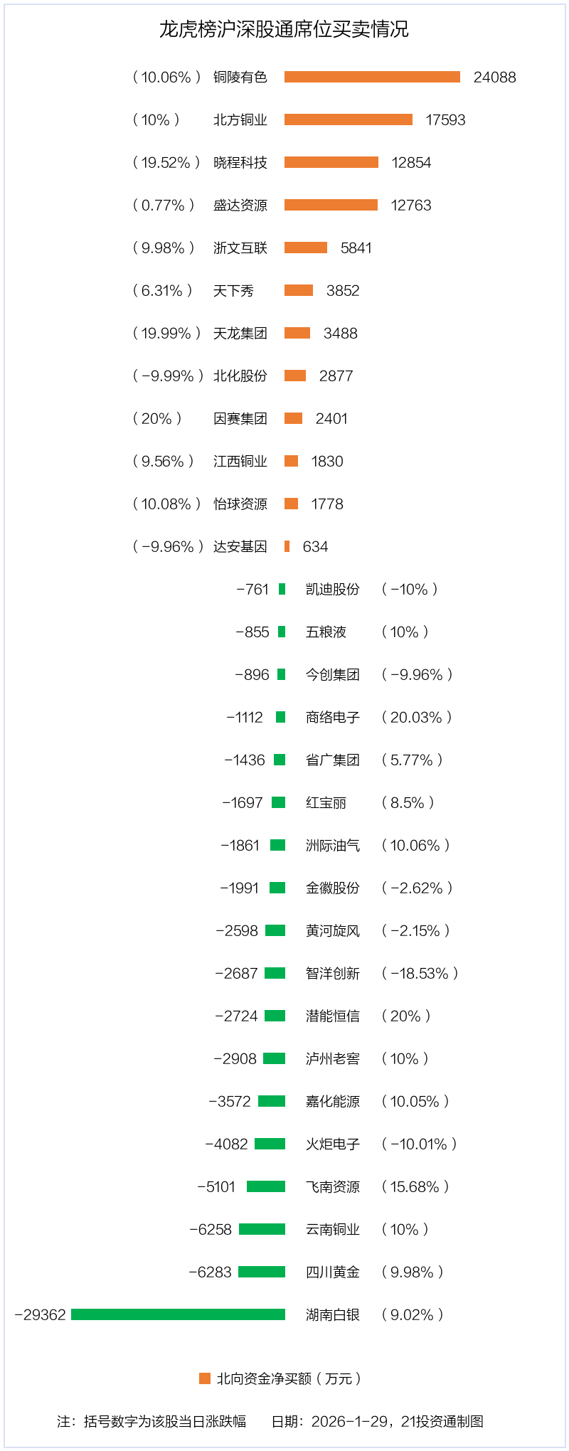 1月29日,北向资金参与龙虎榜中的个股共有30只,合计净买入1.38亿元。其中沪股通净买入4 股,净卖出8 股,合计净卖出5146.09万元;深股通净买入8 股,净卖出10 股,合计净买入1.9亿元。