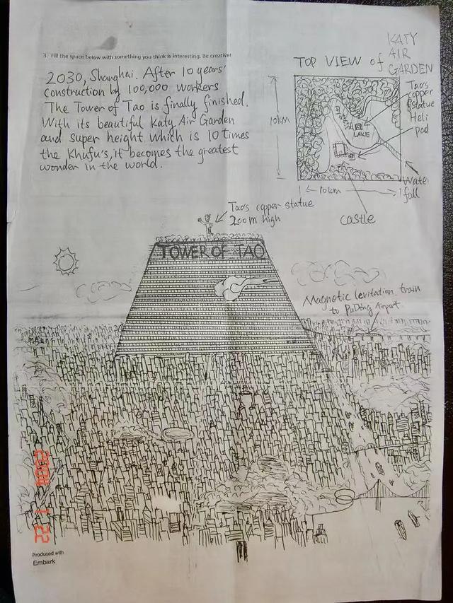 汪滔:我给你看一张我 2002 年画的图。是我当时申请加州理工大学,对方出的题,“Fill the space below with something you think it's interesting,be creative。” 我就画了这么个东西:上海的高楼林立中,耸立着一座巨型金字塔,顶端是空中花园,有瀑布、森林、环湖赛道,还有停机坪。
